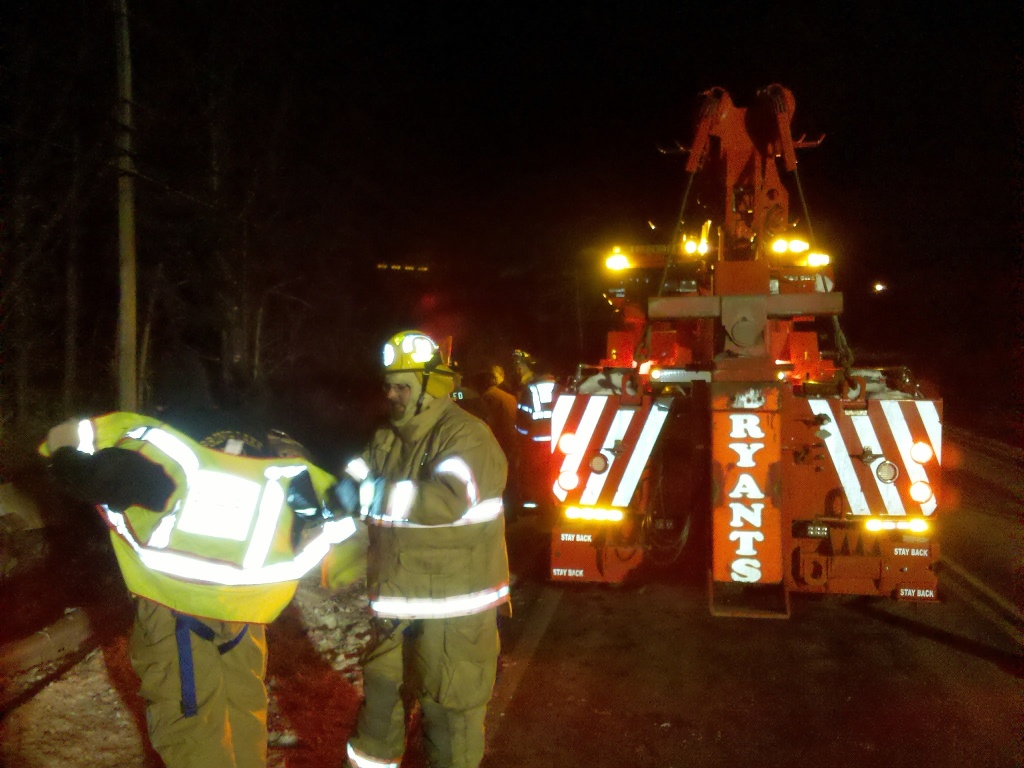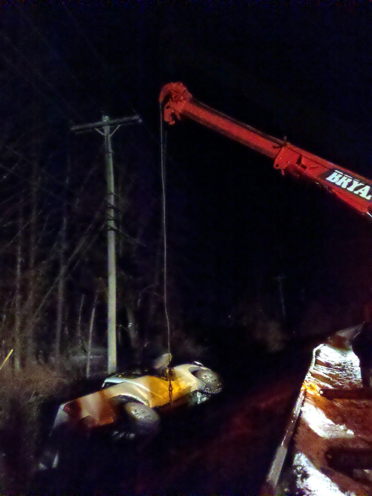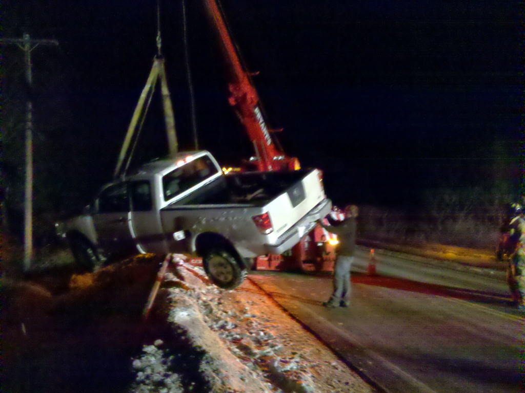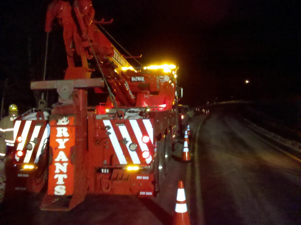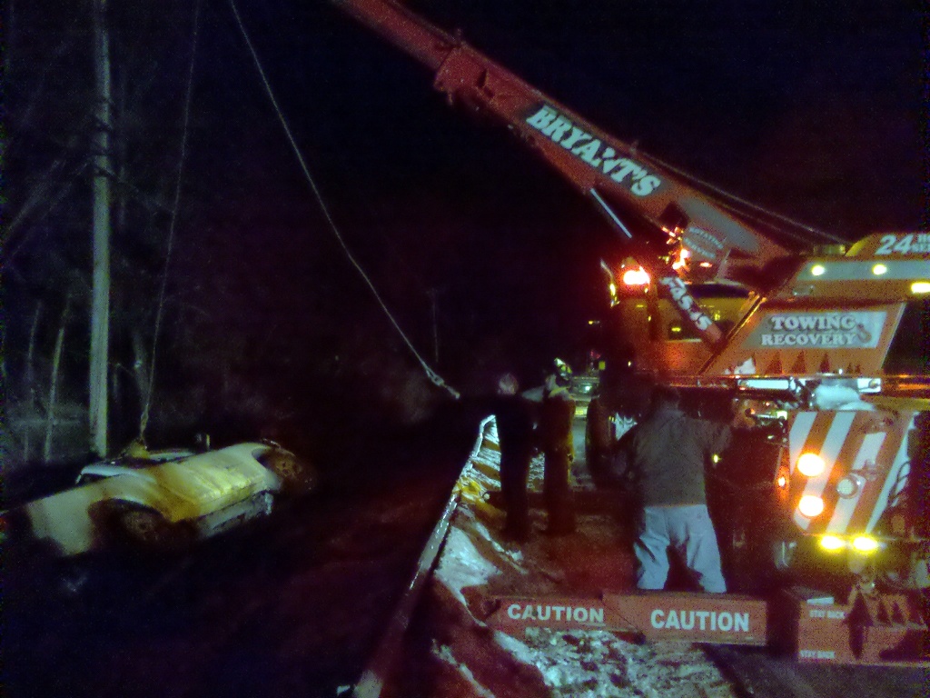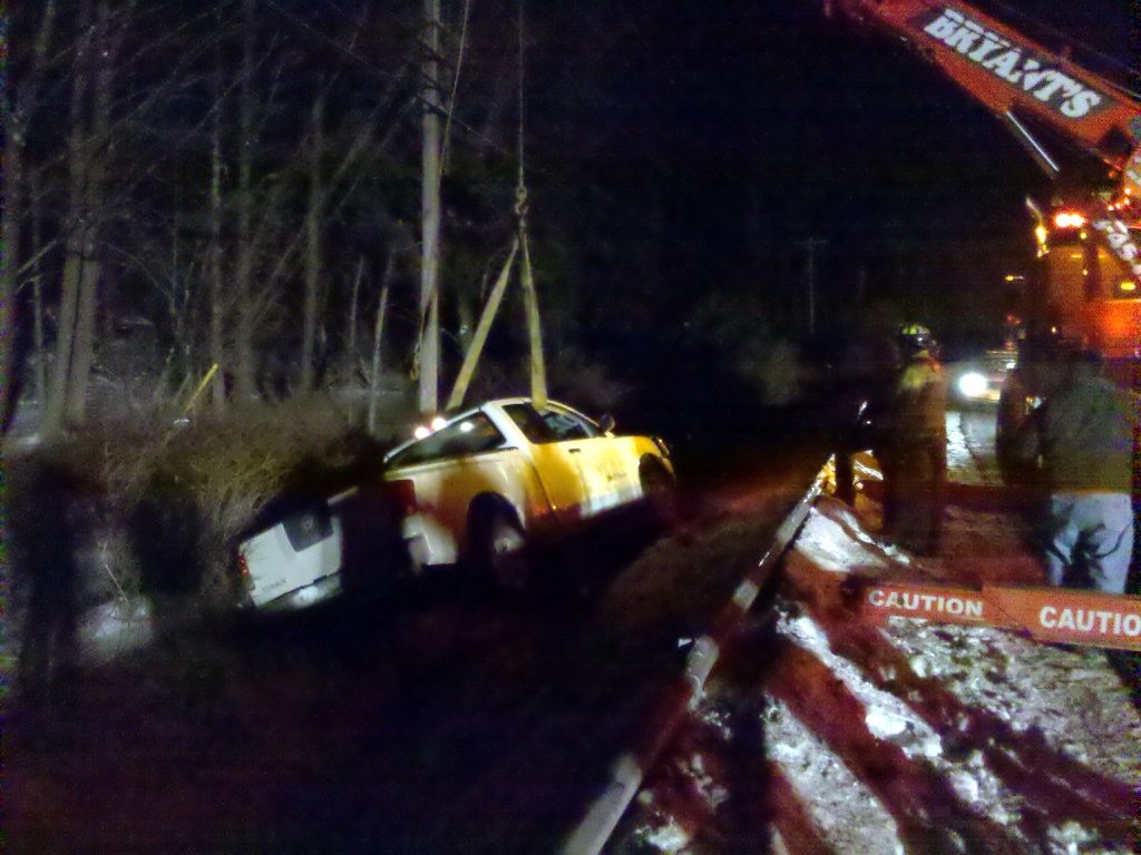 An MVA that occurred right across the street from the firehouse requiring a crane to remove the vehicle from over the embankment. Apologies for the quality, taken on a cell.