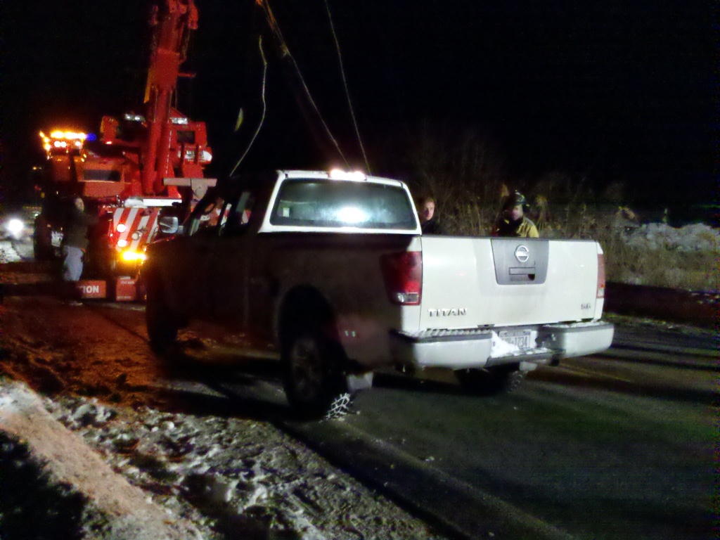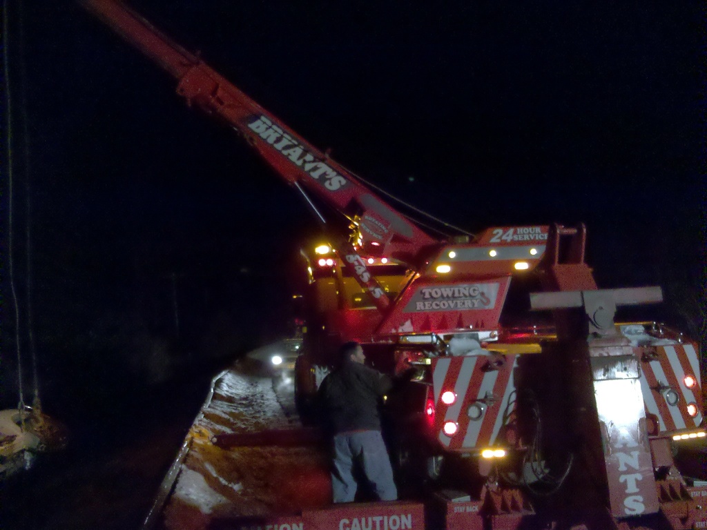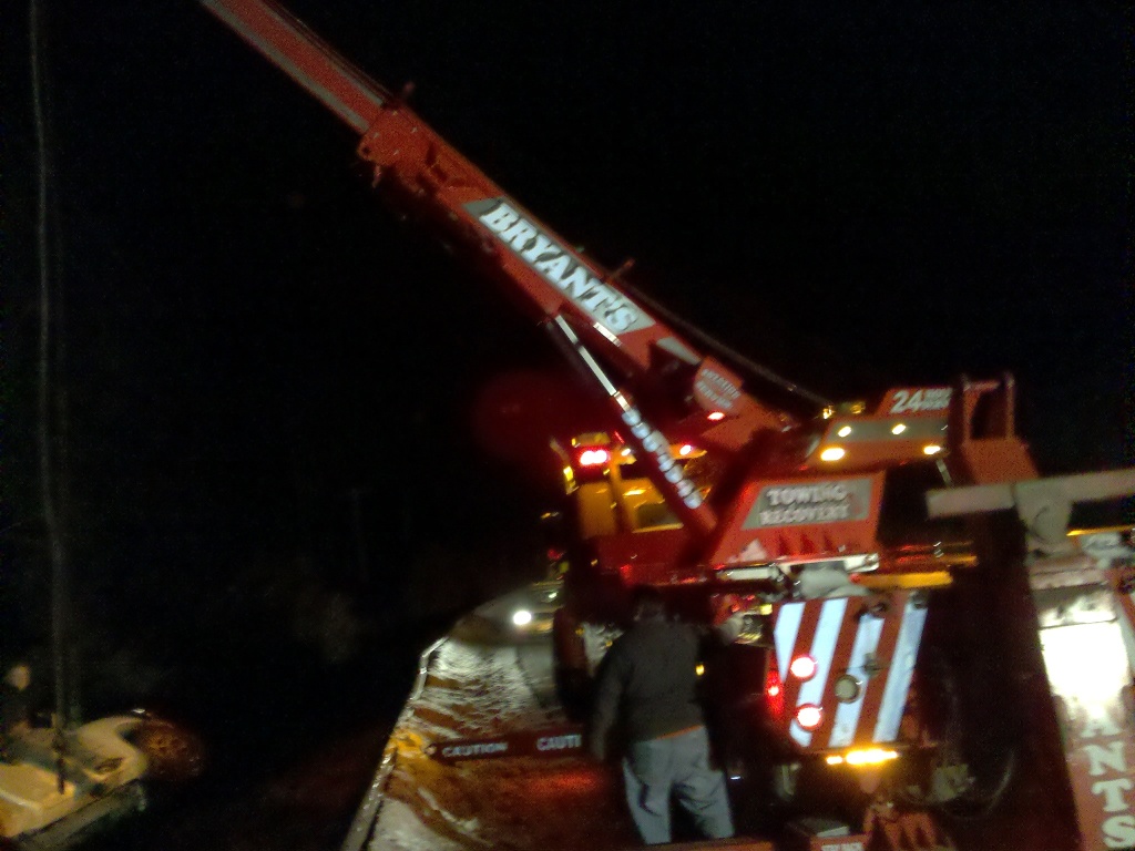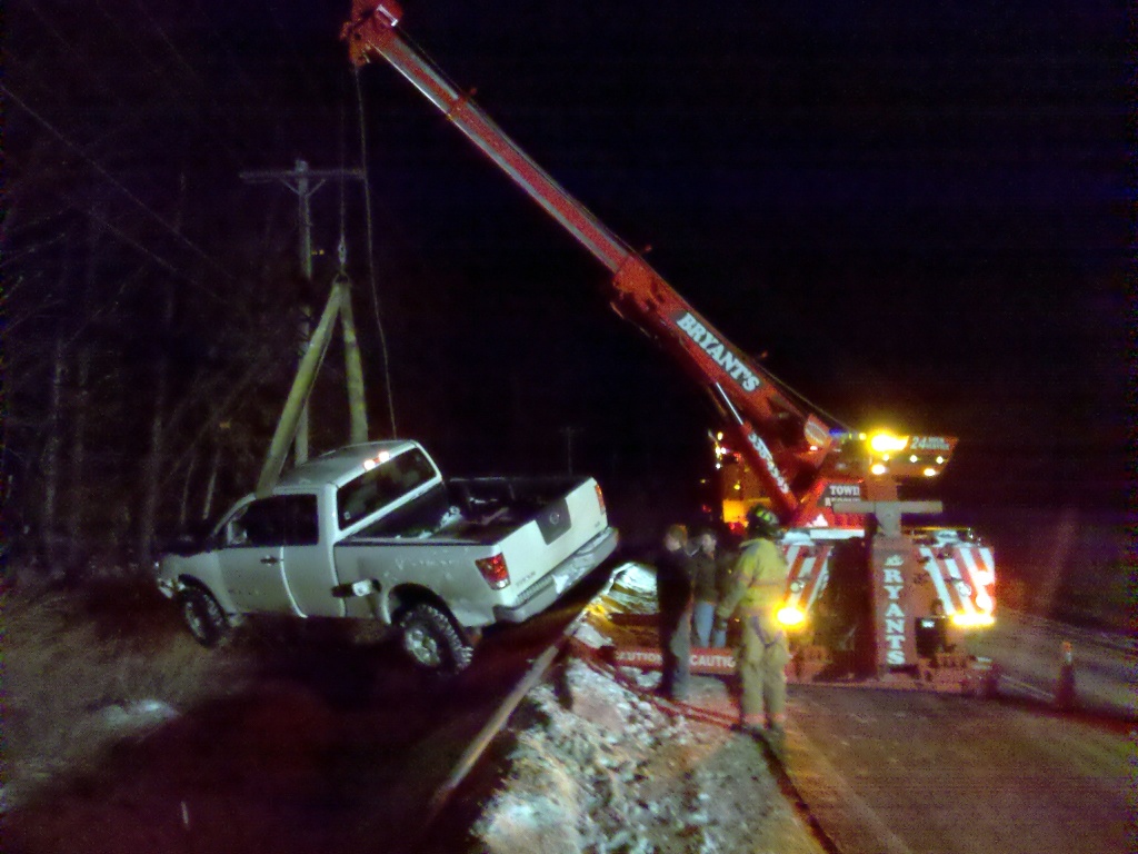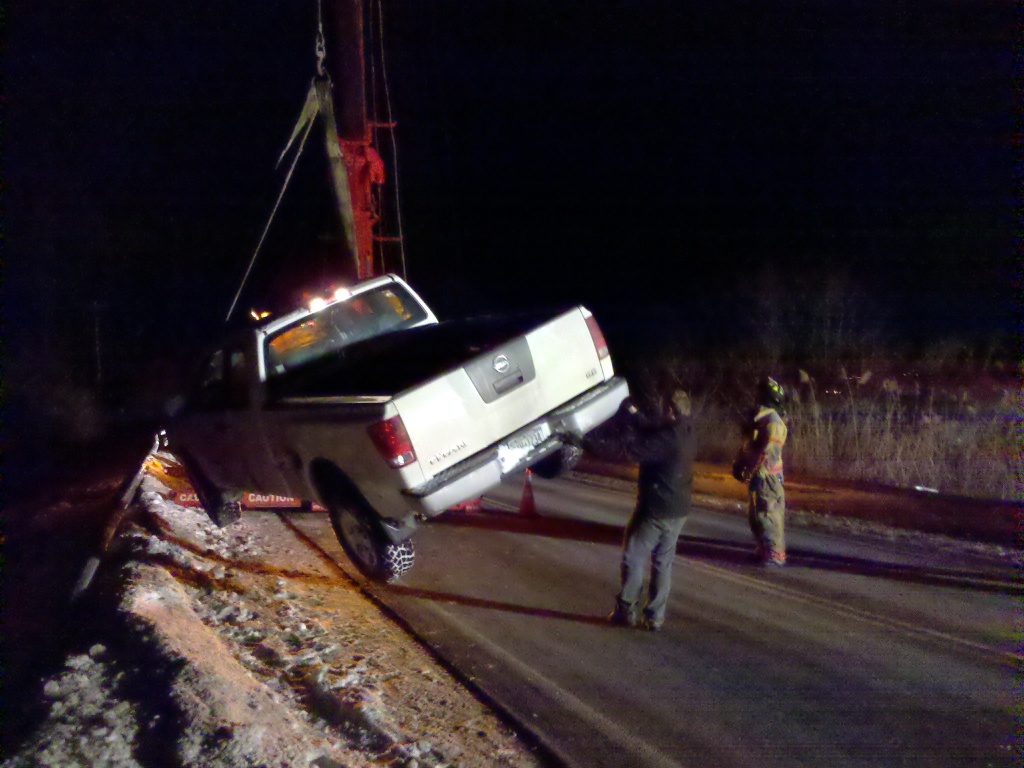 An MVA that occurred right across the street from the firehouse requiring a crane to remove the vehicle from over the embankment. Apologies for the quality, taken on a cell.