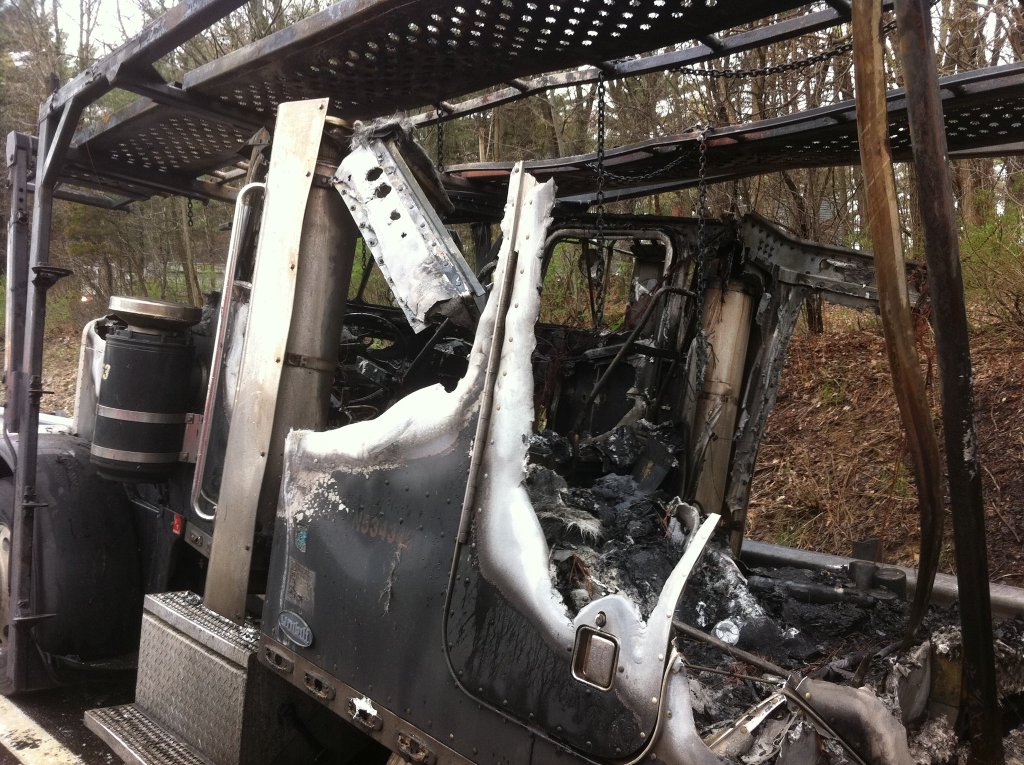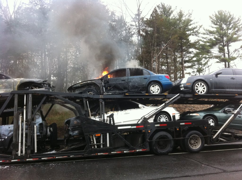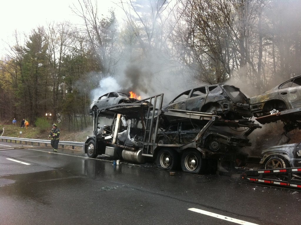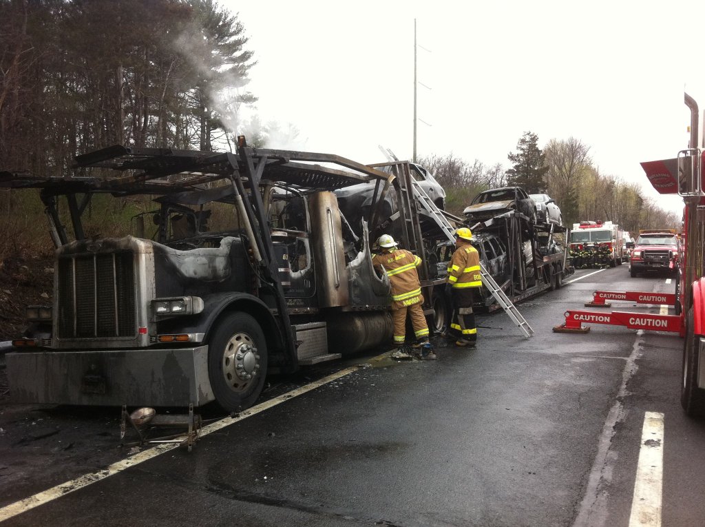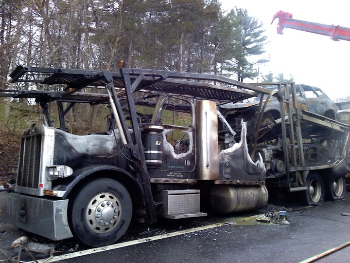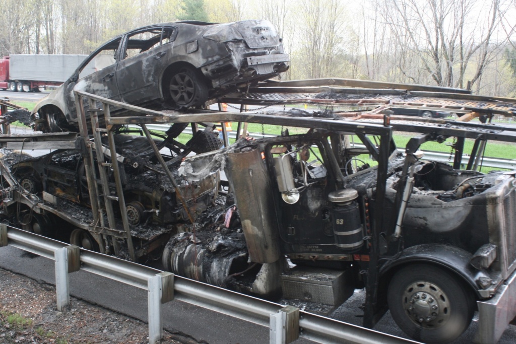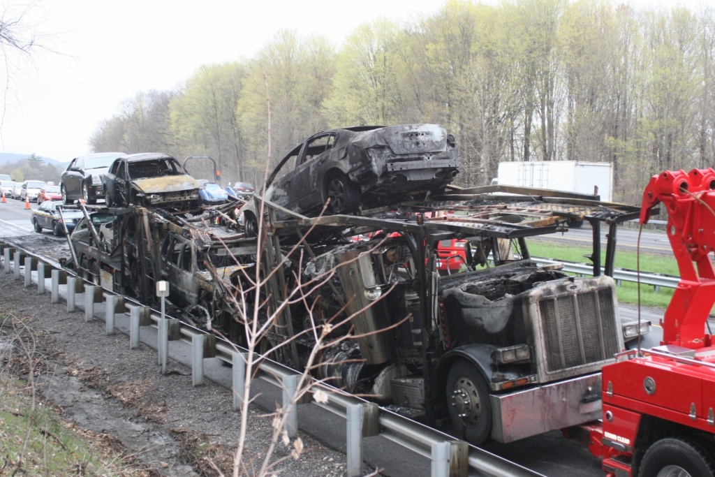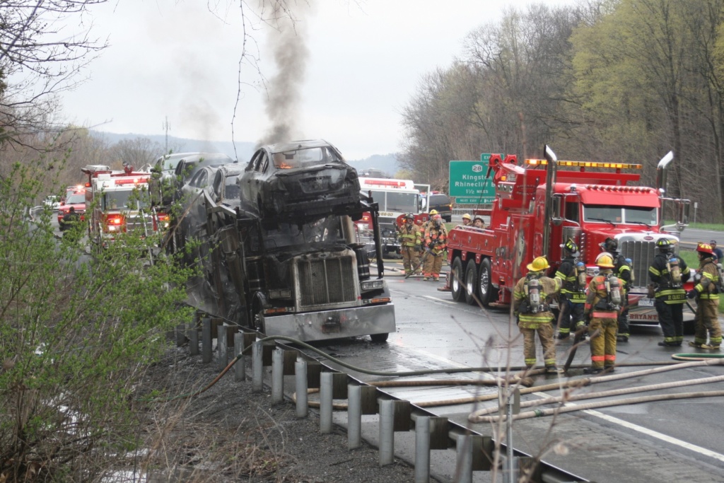 A tractor-trailer carrying cars burns on the Thruway just south of Kingston Monday afternoon. (John Bechtold photo)