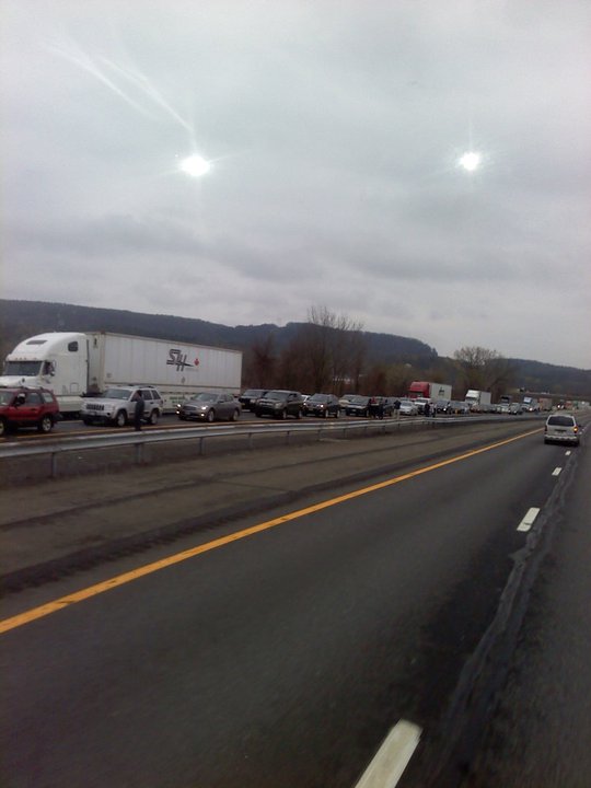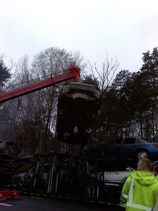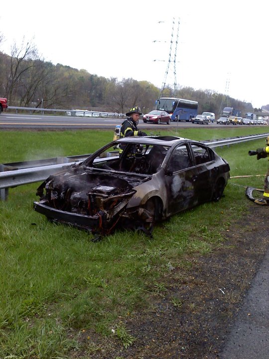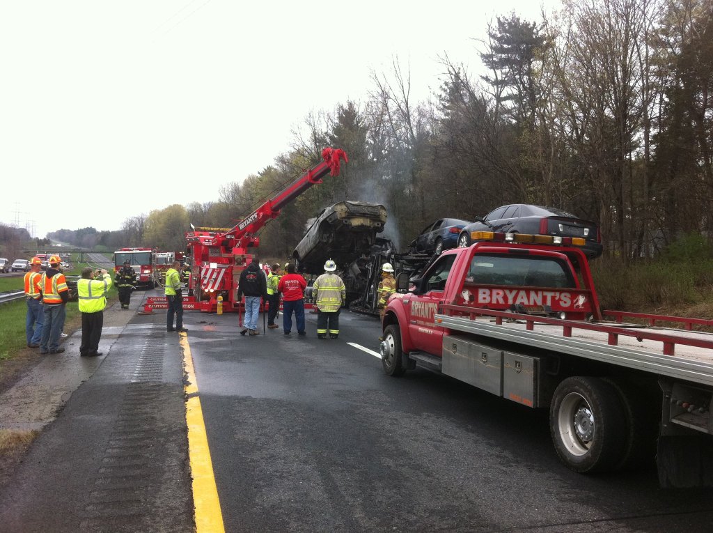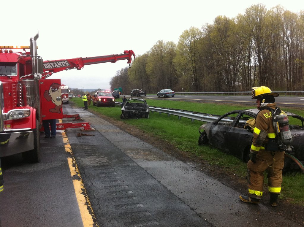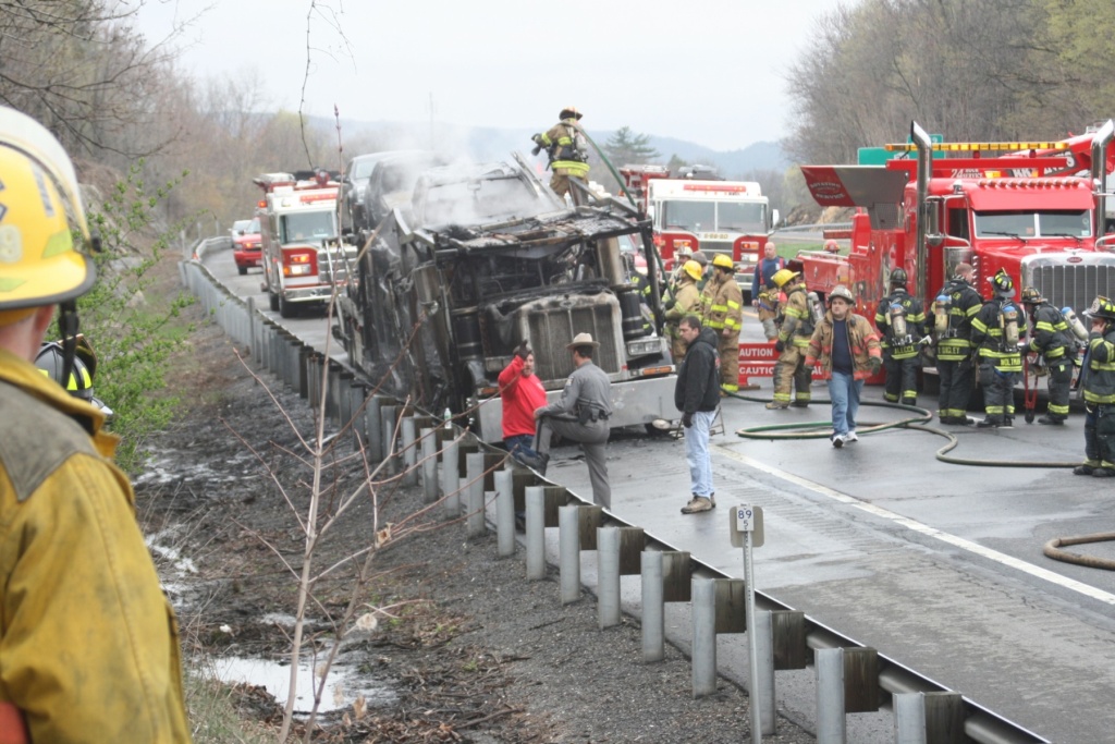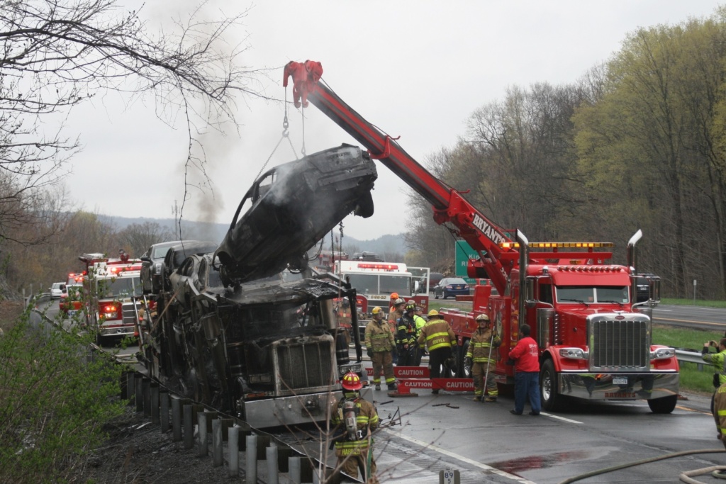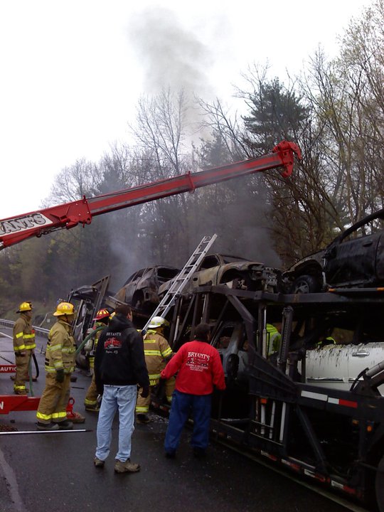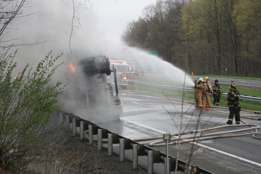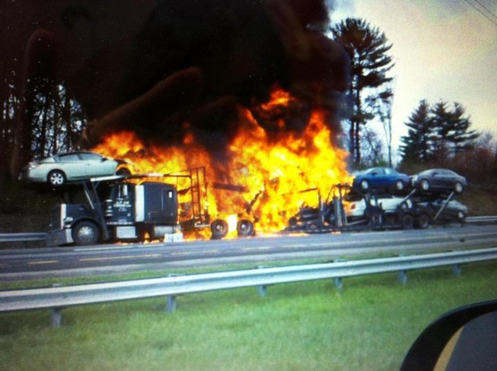A tractor-trailer carrying cars burns on the Thruway just south of Kingston Monday afternoon. (John Bechtold photo)