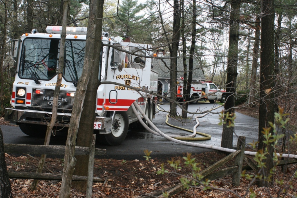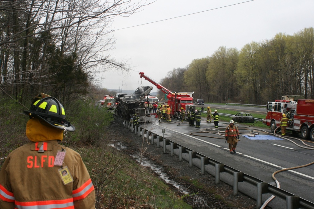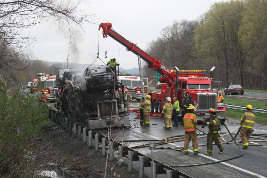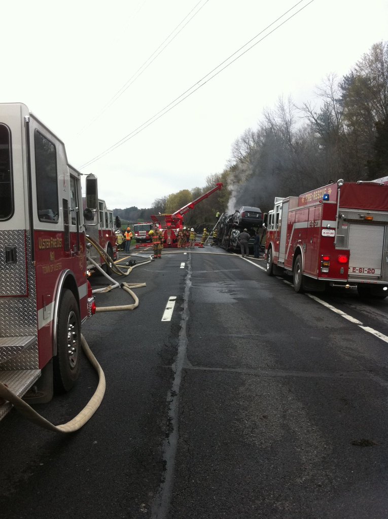 Firefighters attack a car carrier fire Monday afternoon on the Thruway just south of Kingston. (John Bechtold photo)